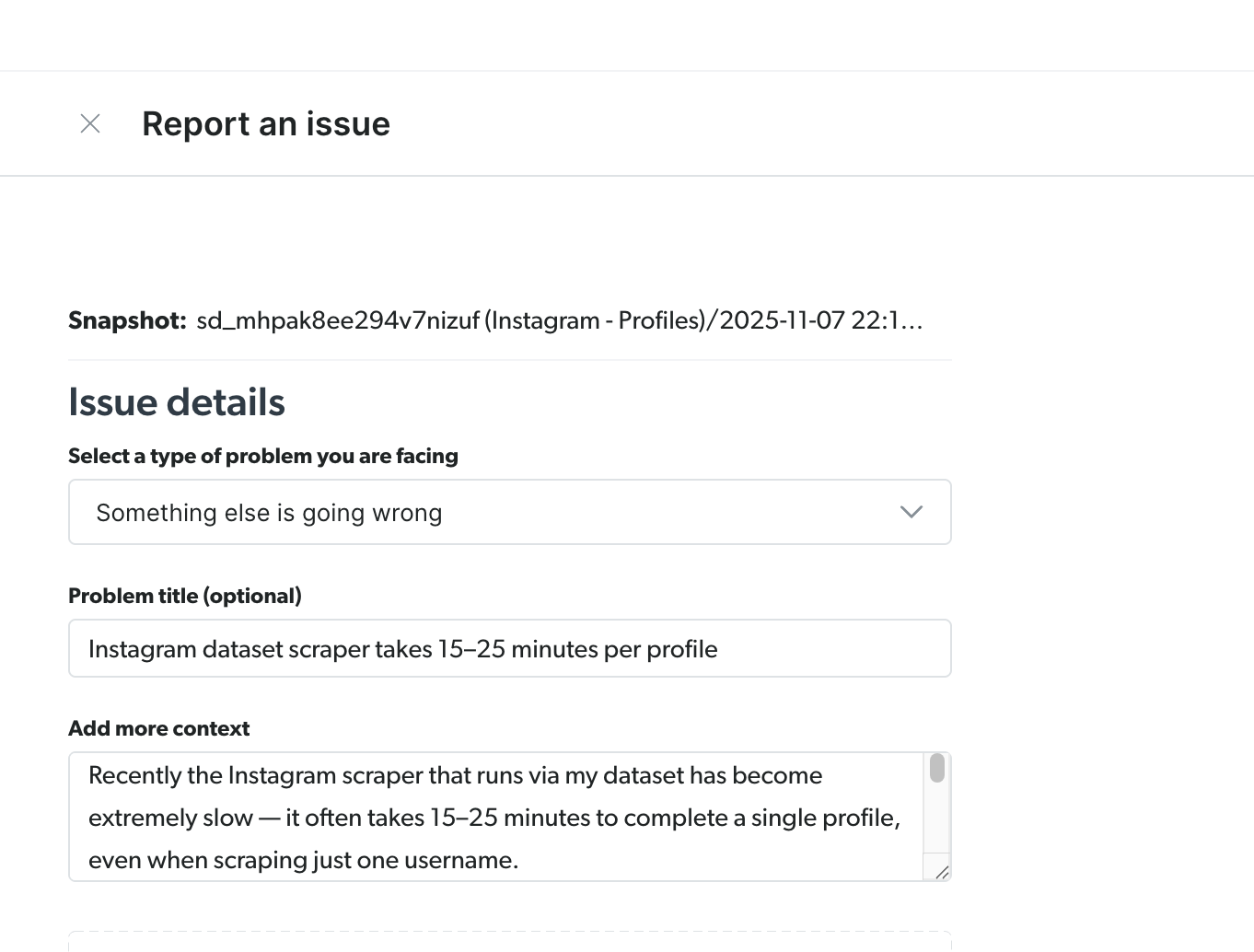 Yesterday evening, right when everything was finally working, Bright Data’s Instagram scraper started acting up. What used to take a few seconds suddenly stretched to 15–25 minutes per profile.