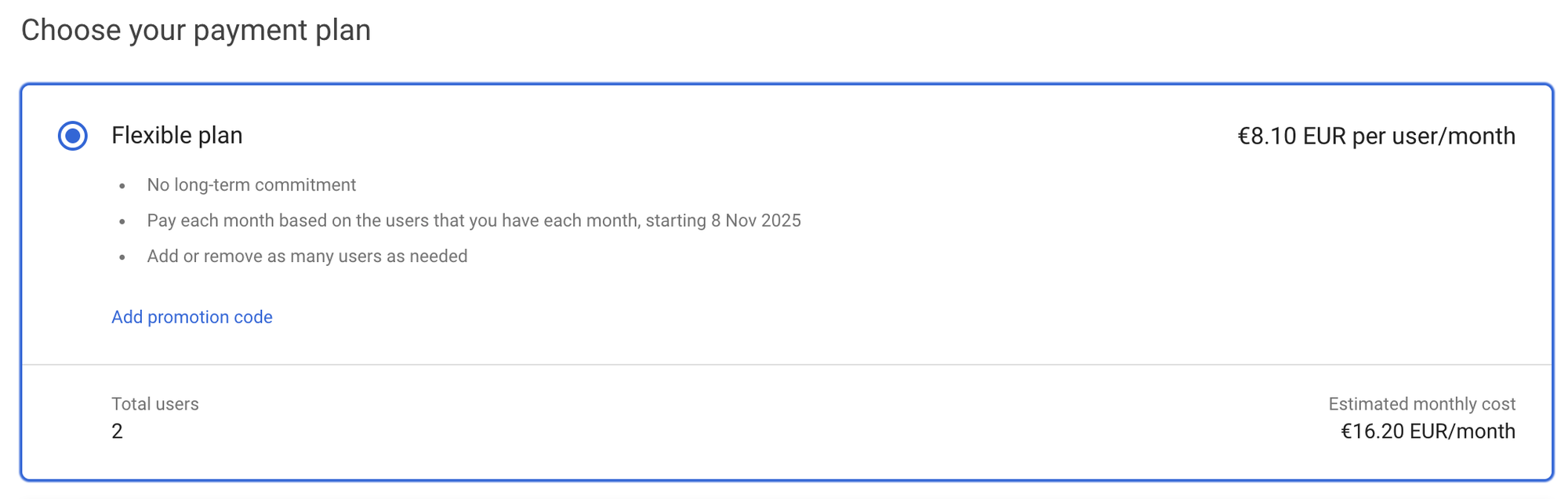 This week I set up Google Workspace for Wykra and somehow it decided that I clearly run a multinational corporation. It didn’t even offer the basic plan it jumped straight to Business Plus, €25.30 per month. I didn’t realize that was the per-user price; I thought it was for the whole workspace. Then I added a second user and now the billing page proudly shows “x2.”