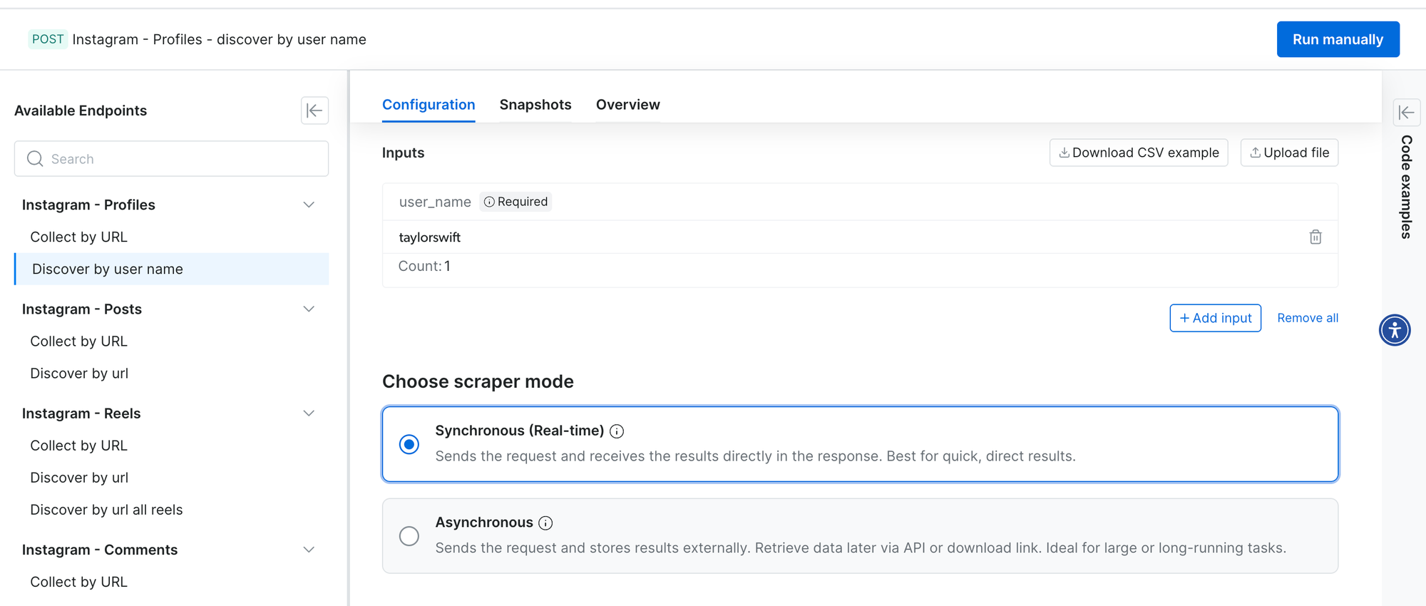 For now we’re focusing on Instagram and using Bright Data’s Instagram API scrapers. They offer two modes: synchronous (real-time) and asynchronous. I went with the async one; Alex’s version uses the real-time one. You can also test profiles manually from the UI - here’s an example with Taylor Swift’s profile.