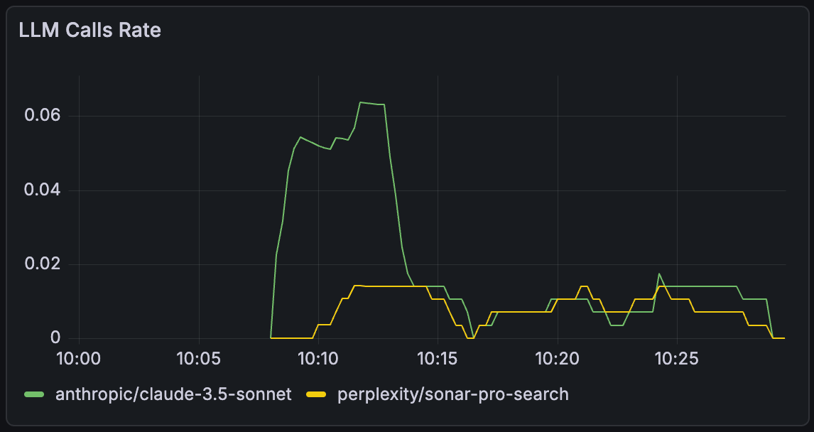 The following panel shows the call rate for the two LLMs during our local test runs. Claude (green) peaks higher because it handles the heavier analysis steps, while Perplexity (yellow) stays lower and more steady. The small drops simply reflect pauses between test batches.