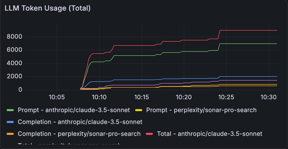 The chart below shows how token usage changes during our test runs. Claude’s prompt and completion tokens (green and blue) spike during the heavier analysis steps, which is why the total line (red) climbs sharply. Perplexity stays much lower. its queries are simpler and produce shorter responses. When the test batch ends, all token rates drop back to near zero until the next run.