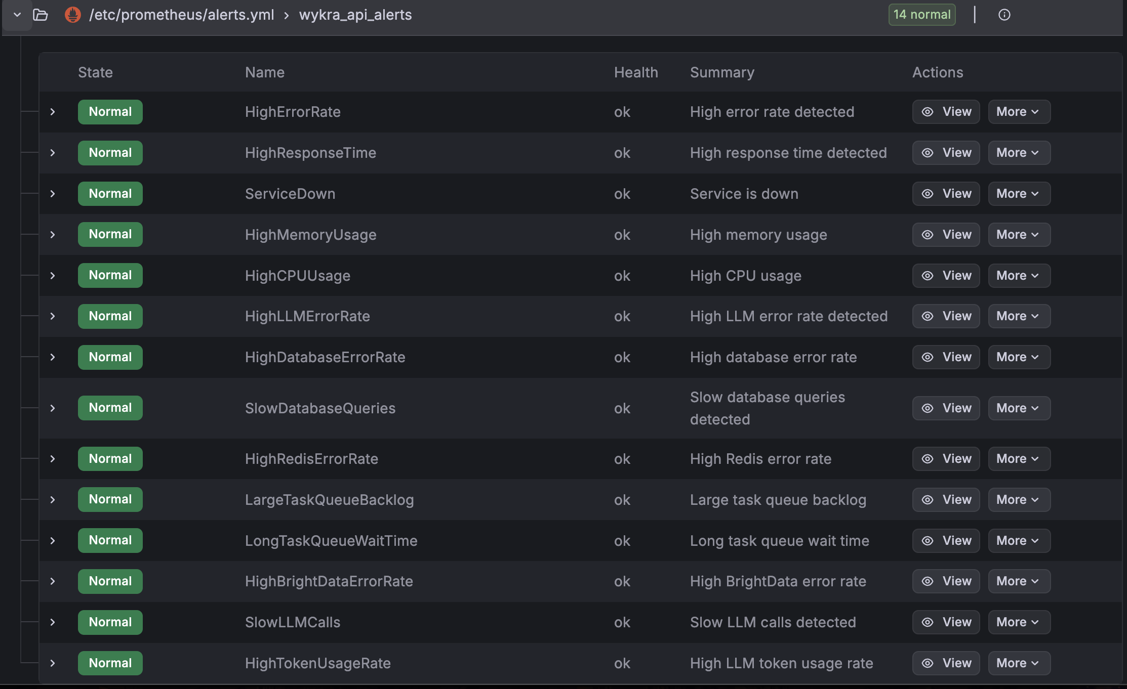 The panel below lists all alert rules we’ve configured - errors, slow responses, resource spikes, LLM issues, database problems, and queue backlogs. Everything is green here because we’re only running test loads.