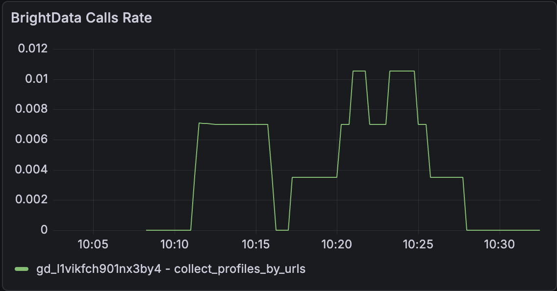You can also look the rate of Bright Data calls during our test runs. The spikes correspond to batches where we’re pulling Instagram profile data, and the flat sections reflect pauses between those batches.