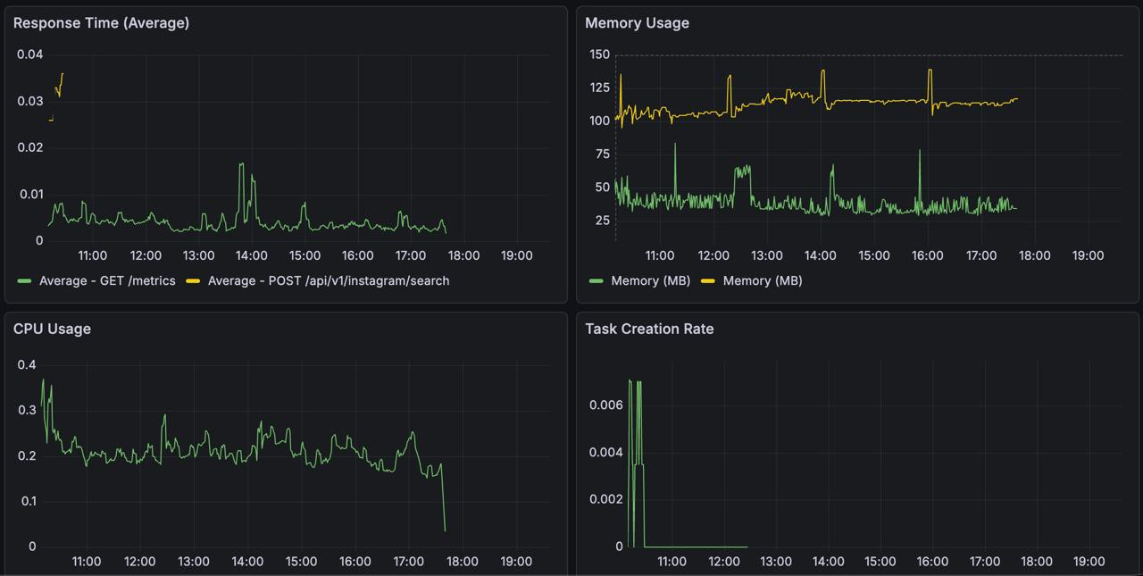 And then we have a dashboard that shows the basics: CPU usage rising during a test run, Instagram search tasks being created and completed at a steady rate and no failures during this window. This simple view is enough to confirm that the pipeline behaves as expected under local load.
